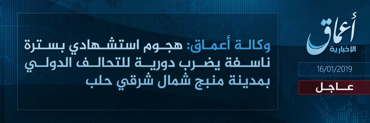 وقالت وكالة أعماق التابعة لتنظيم الدولة الإسلامية إنّ هجوما انتحاريا استهدف دورية تابعة للتحالف الدولي في مدينة منبج السورية يوم الأربعاء. وأضافت ”هجوم استشهادي بسترة ناسفة يضرب دورية للتحالف الدولي بمدينة منبج شمال شرقي حلب“.