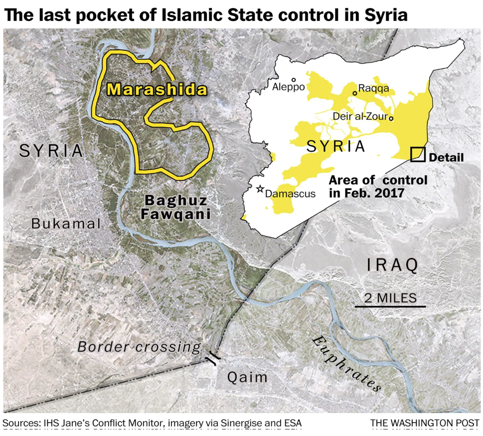 ويخوض بضع مئات من مقاتلي تنظيم داعش الأكثر تعنتاً بصمود معركتهم الأخيرة في قريتي المراشدة والباغوز فوقاني على ضفاف نهر الفرات على بعد بضعة أميال من الحدود العراقية جنوب شرق سوريا. مع وجود الجيش السوري على الضفة الأخرى من النهر، فإنّ المجموعة، التي كانت تسيطر على أرض بحجم «إنجلترا»، أضحت محاصرة في رقعة لا تتجاوز أربعة أميال ( 6 كيلومتر) من قبل «قوات سوريا الديمقراطية» المدعومة من الولايات المتحدة.