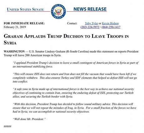 وأصدر السناتور الأمريكي لينزي جراهام بيانا أشاد فيه بقرار ترامب الاحتفاظ بقوة أمريكية صغيرة في سوريا ضمن قوة دولية لتحقيق الاستقرار قائلا إن الرئيس أخذ بالنصيحة العسكرية السليمة التي ستساعد في تفادي المشاكل التي واجهتها الولايات المتحدة بالعراق.