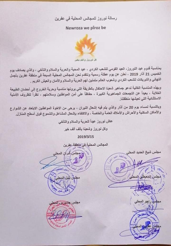 أبلغت تركيا المجالس المحلية التي شكلتها في عفرين بحظر أي مظاهر احتفالية بعيد نوروز. وهو أحد الأعياد القومية التي يحتفل بها الكرد كل عام.