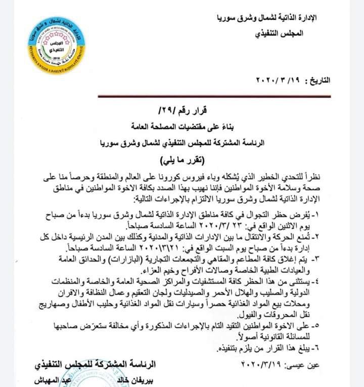 أعلنت سلطات (الإدارة الذاتية) حظر تجوال في كافة مناطق شمال وشرق سوريا بدءاً من صباح يوم الاثنين 23 آذار/مارس 2020 الساعة السادسة صباحاً وذلك ضمن إجراءات اتخذتها للوقاية من انتشار فيروس كورونا.