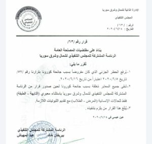 قالت الإدارة الذاتية يوم الأحد 14 حزيران يونيو 2020 إنّها ستتخذ مزيدا من الإجراءات لتخفيف القيود التي فرضت للحد من تفشي فيروس كورونا، بدءا من الثلاثاء 16 حزيران وذلك برفع الحظر المفروض ولكنها قررت الإبقاء على جميع المعابر مغلقة لحين صدور قرار آخر من الرئاسة المشتركة للمجلس التنفيذي في شمال وشرق سوريا، باستثناء معبري (التايهة والطبقة) اللذان تم إعادة فتحهما فقط للحالات الإنسانية (المرضى والطلاب) مع تقديم الثبوتيات اللازمة”.
