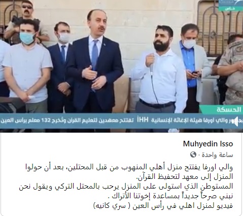 قال الصحفي الكردي السوري محي الدين عيسو إنّ السلطات التركية قامت بالاستيلاء على منزل عائلته في مدينة رأس العين \ سري كاني، وحولته إلى “معهد لتحفيظ القرآن”، وشارك عيسو الذي يعيش في ألمانيا مقطع فيديو يظهر الوالي التركي برفقة جنود أتراك وعدد من الأهالي وهم يفتتحون “معهدا لتحفيظ القرآن” قال عيسو إنّ مقر المعهد هو منزل عائلته، الذي تعرض للنهب والاستيلاء عليه.
