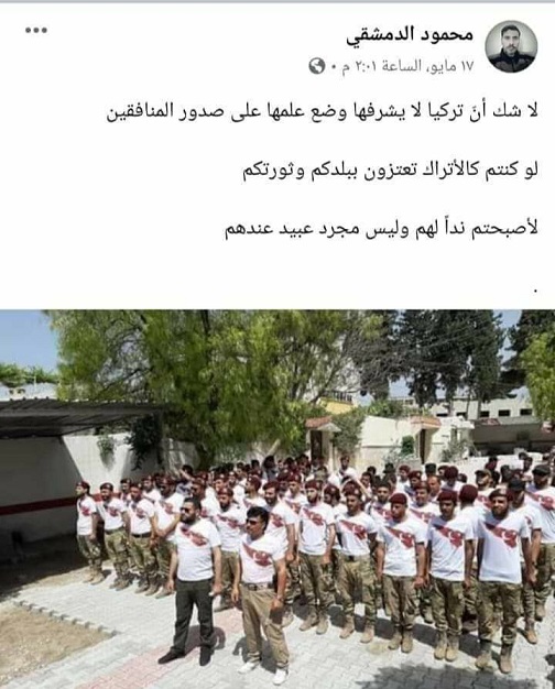 وكان الدمشقي قال، في منشوره الذي أوقف بسببه، “لا شك أنّ تركيا لا يشرفها وضع علمها على صدور المنافقين، لو كنتم كالأتراك تعتزون ببلدكم وثورتكم، لأصبحتم نداً لهم وليس مجرد عبيد عندهم”، مرفقاً منشوره بصورة لعناصر من “الجيش الوطني”، المدعوم من تركيا.