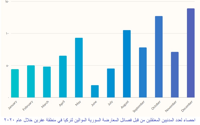 وقال ( مركز التوثيق ) إنّ الأجهزة الأمنية وفصائل الجيش الوطني صعدت من وتيرة الانتهاكات وفق البيانات التالية خلال شهر كانون الثاني تم اعتقال ( 44 ) شخصاً، في شباط تم اعتقال ( 50 شخصاً )، في آذار تم اعتقال ( 48 شخصا ) ، في شهر نيسان تم اعتقال ( 65 شخصا ) ، في شهر أيار تم اعتقال ( 93 شخصا ) ، في شهر حزيران تم اعتقال ( 19 شخصا ) ، في شهر تموز تم اعتقال ( 45 شخصا ) ، في شهر آب تم اعتقال ( 105 شخصا ) ، في شهر أيلول تم اعتقال ( 78 شخصا ) ، تشرين الأول تم اعتقال ( 127 شخصا ) في شهر تشرين الثاني تم اعتقال ( 71 شخصا ) ، في شهر كانون الأول تم اعتقال ( 139 شخصا ). وهؤلاء هم المعتقلون الذين تمكن المركز من توثيق أسمائهم، فيما العدد الفعلي أكثر من ذلك لا سيما أنّ هنالك أسماء تحفظت عائلاتهم على ذكرها، إضافة لحالات اعتقال لم نتمكن من الوصول إليها، كما وتم متابعة وتوثيق مقتل مدنيين تحت التعذيب، وحالات انتهاك متعددة.