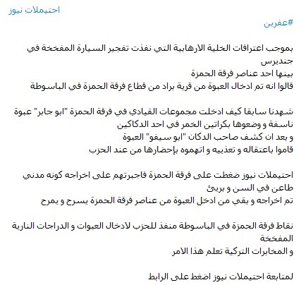 ووجدوا على الجثة ورقة كتب عليها “إلى كل من تسوله نفسه بالعبث بأمن المناطق المحررة والعبث بأرواح المدنيين الأبرياء بالتفجيرات والاغتيالات ونقل المعلومات إلى الإرهابيين من داعش وpkk (وحدت الحماية الكردية) وعصابات النظام المجرم..”.