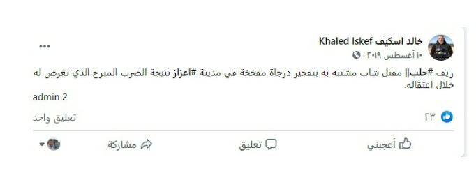 وفي فترات سابقة، تم توثيق قتل مشتبه بهم آخرين ، بتاريخ 10 أغسطس 2019 قتل شاب مشتبه به بتفجير دراجة مفخخة في مدينة اعزاز نتيجة الضرب المبرح الذي تعرض له خلال اعتقاله، وتم دعسه في الشارع حتى الموت.