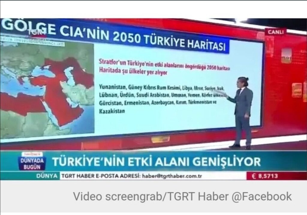 الخريطة نشرتها قناة TGRT التابعة للحكومة التركية، وشملت سوريا والعراق والأردن ومصر وليبيا وشبه الجزيرة العربية بأسرها واليونان، إضافة إلى منطقة ما وراء القوقاز وبعض أقاليم في جنوب روسيا والقرم وشرق أوكرانيا وأجزاء من كازاخستان وتركمانستان ، وتم استثناء دولتين هما اسرائيل وايران.