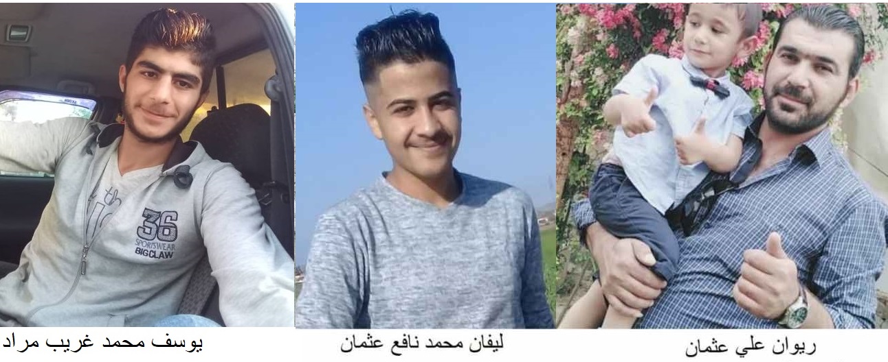 والأشخاص الثلاثة من أهالي قرية تل جمال في ديريك بريف الحسكة ، وهم : ريوان على عثمان ( العمر 33 عاماً ، مواليد 1986) ، ليفان محمد نافع عثمان ( العمر 16 عاماً \مواليد 2004) ، يوسف محمد غربي مراد ( العمر 16 عاماً ، مواليد 2004).