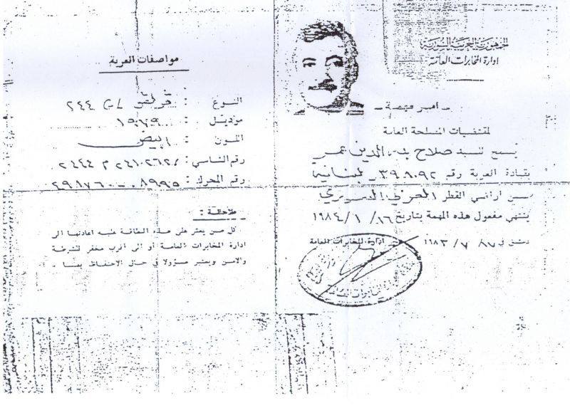 في هذه الوثيقة التي تحمل الصورة الشخصية لصلاح بدر الدين منحته المخابرات السورية أمر مهمة يخوله لقيادة الآلية الموصوفة في متن الوثيقة “لمقتضيات المصلحة العامة، يسمح للسيد صلاح بدر الدين عمر بقيادة العربة رقم \ 3901092 \ – لبنانية ، ضمن أراضي القطر العربي السوري” وقد منحت له هذه الرخصة بتاريخ 17 تموز من عام 1983 وكان تتجدد باستمرار.