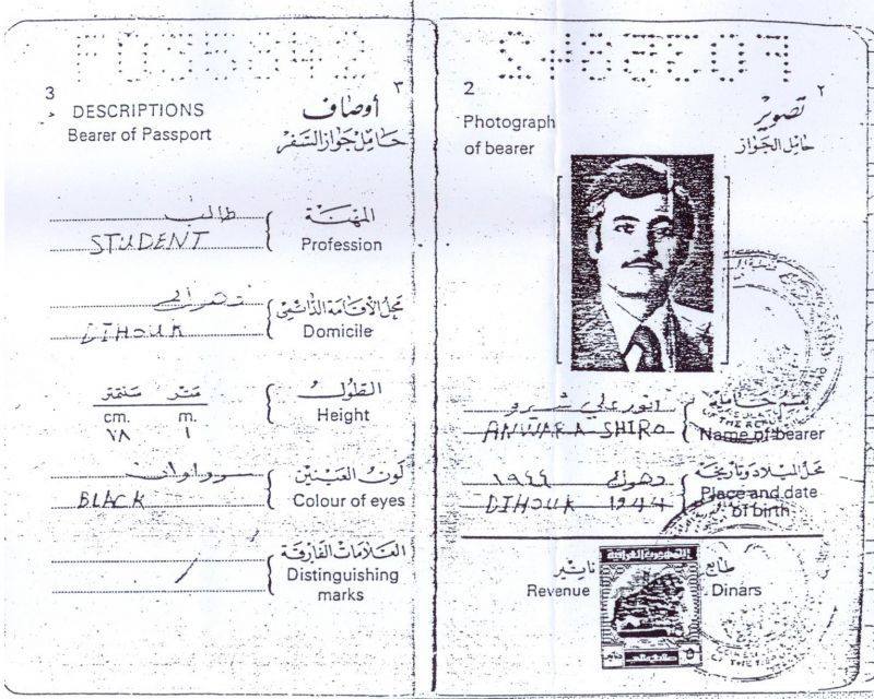 2- حصل صلاح في عام 1974 من السلطات العراقية على جواز سفر عراقي باسم ” أنور علي شيرو”، والغريب في الأمر أنّ السلطات العراقية منحته جواز السفر بعد فشل اتفاقية 11 آذار بينها والحزب الديمقراطي الكردستاني، بل بعد يوم واحد فقط من بدء الثورة أي في يوم 29 آذار..