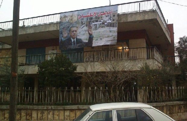 “أردوغان الانكشاري .. لص حلب”، كتبت هذه العبارة على صورة للرئيس التركي رجب طيب أردوغان، وعلقت على المبنى المؤقت لغرفة الصناعة في مدينة حلب.