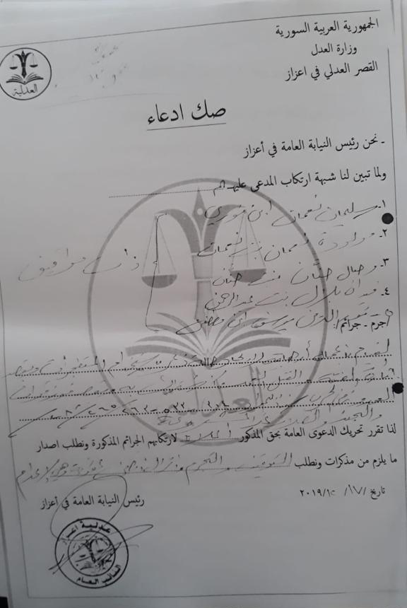 ــ وصال حنان بنت حنان أمين من مواليد 1986 عفرين، وبعد ما يقارب الستة أشهر من الإخفاء القسري أُحيلوا من قبل “النيابة العامة في إعزاز” بتاريخ 17/12/2019 إلى “قاضي التحقيق محمد وليد جبران” الذي طالب في قراره الصادر بتاريخ 18/2/2020م بمحاكمة الأربعة أمام “محكمة الجنايات” بجرائم “القيام بأعمال إرهابيّة بقصد إيجاد حالة ذعر باستخدام المتفجرات والتجنيد في صفوف العدو ومؤازرته على فوز قواته وإضعاف الشعور الوطنيّ وإيهان نفسيّة الأمة زمن الحرب والقتل العمد مستنداً لأحكام المواد /263-265-285-304-533/ من قانون العقوبات السوريّ والتي تشمل عقوبة الإعدام”، وقرر منع محاكمة معتقل آخر في الدعوى ذاتها.