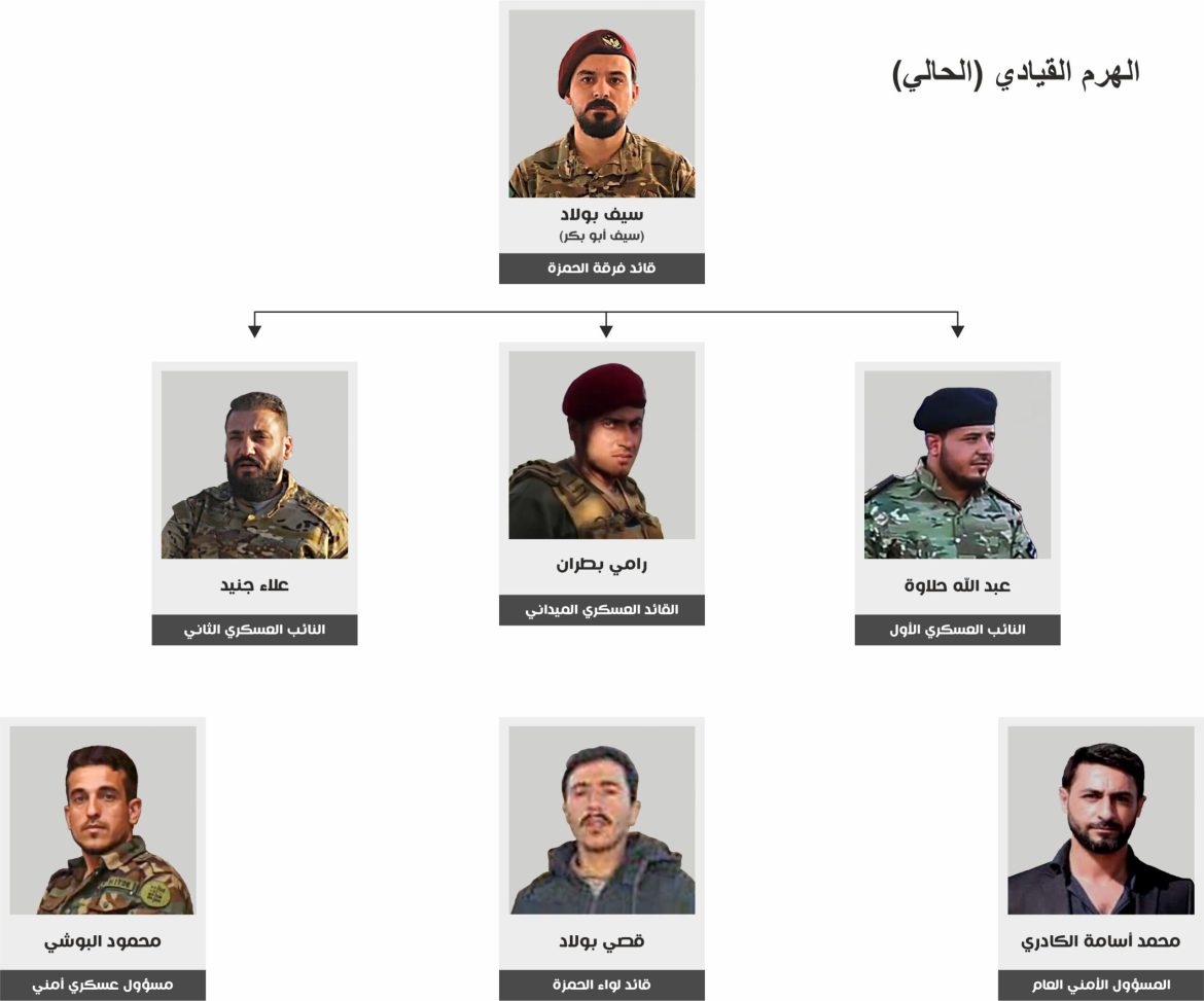 تعتبر فرقة الحمزة من أكثر الفصائل تعقيداً من حيث هيكليتها وترتيب قادتها، وذلك بسبب العدد الكبير وتوزعهم على منطقة جغرافيةٍ واسعة، لكن بمجرد ذكر اسم “الحمزات” كما هو متعارف عليه محلياً يعرف الجميع أنّ هذا الاسم مرتبط بـ سيف بولاد (سيف أبو بكر) الأكثر ظهوراً عبر وسائل الإعلام، والذي يحرص على تقديم صورةٍ براقةٍ للفرقة من خلال خطاباته في جميع المناسبات، لكنها في الواقع لديها سجل حافل بالانتهاكات والجرائم.