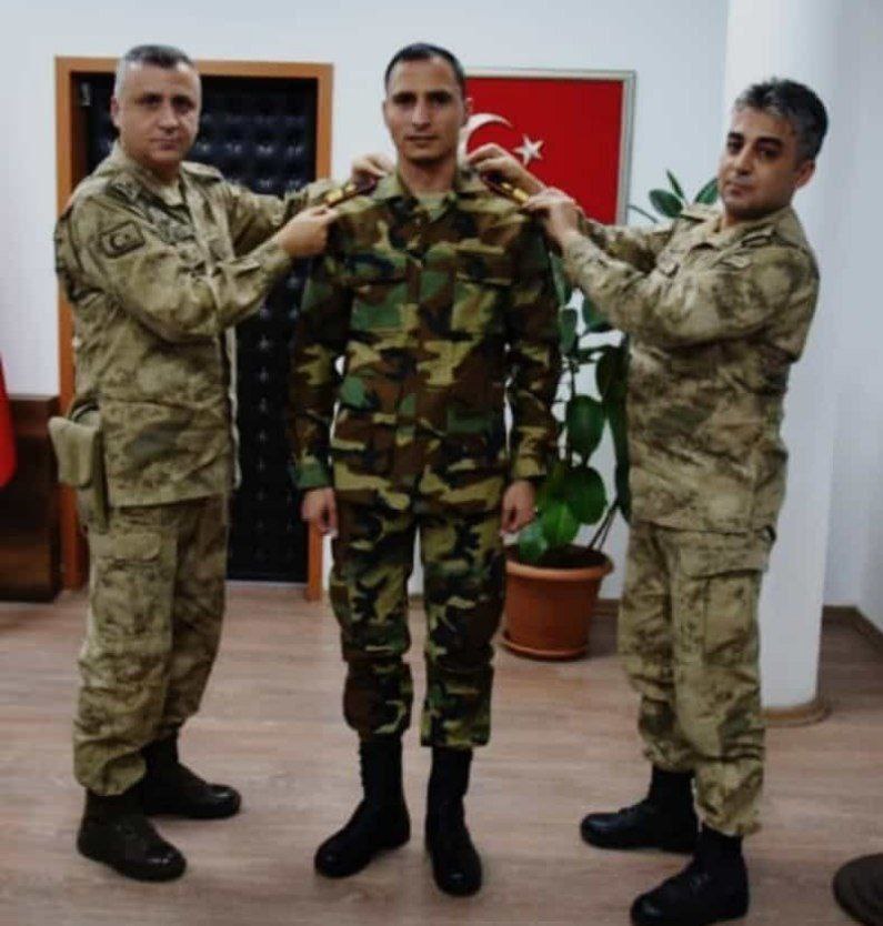 جنود اتراك يكرمون احد قادة المرتزقة السوريين في بلدة رأس العين