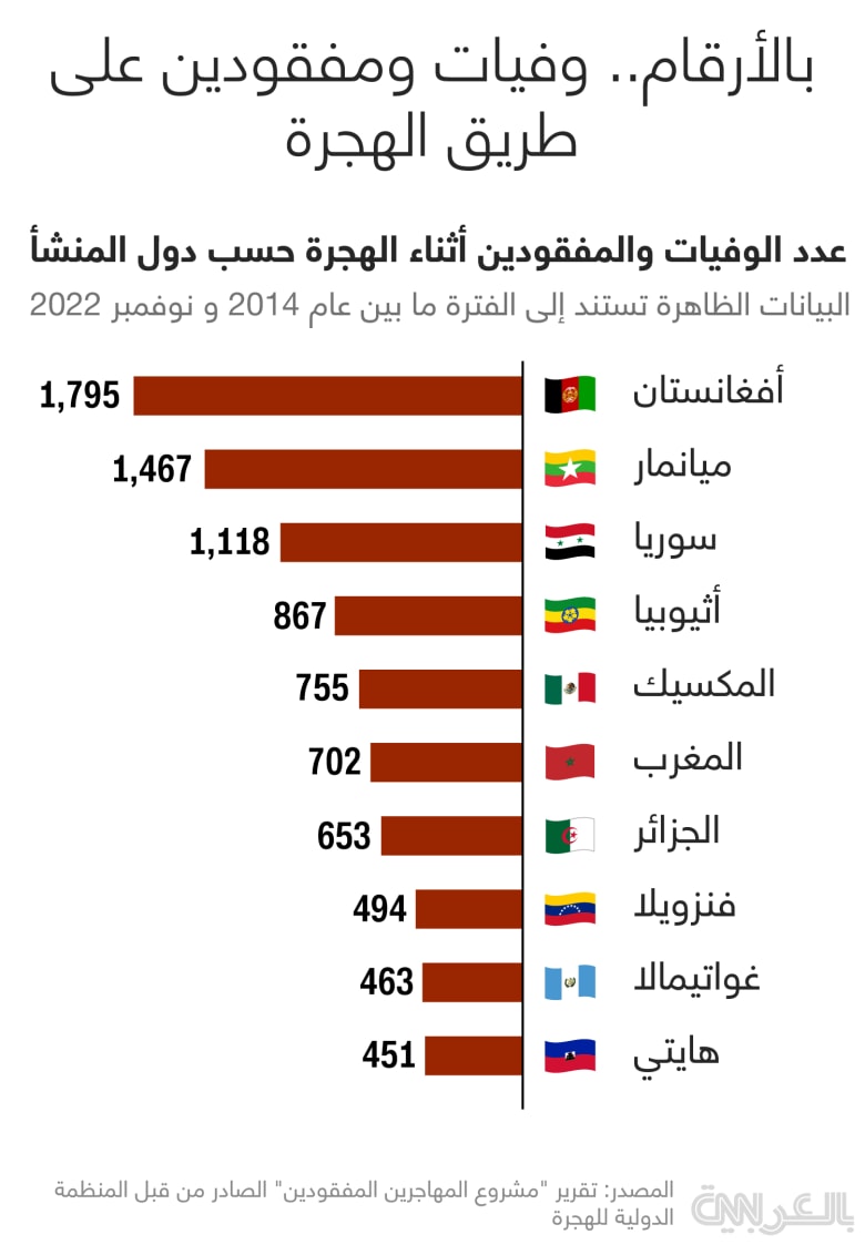 حلت سوريا ثالثا ضمن مشروع “المهاجرين المفقودين” الصادر من قبل المنظمة الدولية للهجرة الذي يهدف إلى تسجيل الأفراد الذين لقوا حتفهم في طريق الهجرة نحو وجهة دولية منذ 2014.